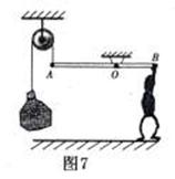 14.如图7是举重运动员小宇自制的训练器械,杠杆AB长1.5m,可绕固定点O在竖直平面内自由转动,A端用细绳通过滑轮悬挂着体积为0.015m3的沙袋,其中OA=1m,在B端施加竖直向上600N的作用力时,杠杆AB在水平位置平衡,试求沙子的密度。(
