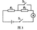 如图3所示,电源电压保持不变。当开关S1 合、S2断开时,电流表的示数为0.2A;当开关S1、S2都闭合时,电流表的示数为O.8A。则电阻R1与R2的比值为( )