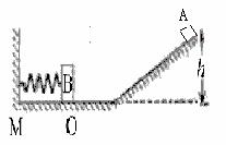 15、(16分) 如图所示,坡道顶端距水平面高度为h,质量为m1的小物块A从坡道顶端由静止滑下,进入水平面上的滑道时无机械能损失,为使A制动,将轻弹簧的一端固定在水平滑道延长线M处的墙上,一端与质量为m2的档板B相连,弹簧处于原长时,B位于滑道O点。A与B碰撞时间极短,碰后结合在一起共同压缩弹簧,已知各处的摩擦不计,重力加速度为g,求: