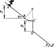 17、(12分)2009哈尔滨第24届大学生冬季运动会的高山滑雪。有一滑雪坡由AB和BC组成,AB是倾角为37°的斜坡,BC是半径为R=5m的圆弧面,圆弧面和斜面相切于B,与水平面相切于C,如图所示,AB竖直高度差hl=8.8m,竖直台阶CD高度差为h2=5m,台阶底端与倾角为37°斜坡DE相连.运动员连同滑雪装备总质量为80kg,从A点由静止滑下通过C点后飞落到DE上(不计空气阻力和轨道的摩擦阻力,g取10m/s2,sin37°=0.6,cos37°=0.8).求: