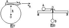 18、如图8所示,MN为水平放置的光滑圆盘,半径为1.0m,其中心O处有一个小孔,穿过小孔的细绳两端各系一小球A和B,A、B两球的质量相等。圆盘上的小球A作匀速圆周运动。问(1)当A球的轨道半径为0.20m时,它的角速度是多大才能维持B球静止?(2)若将前一问求得的角速度减半,怎样做才能使A作圆周运动时B球仍能保持静止?
