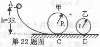 (10分)如图所示半径为R、r(R>r)甲、乙两圆形轨道安置在同一竖直平面内,两轨道之间由一条水平轨道(CD)相连,如小球从离地3R的高处A点由静止释放,可以滑过甲轨道,经过CD段又滑上乙轨道后离开两圆形轨道,小球与CD段间的动摩擦因数为
