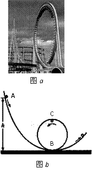23.(10分) 游乐场的过山车可以底朝上在圆轨道上运行,游客却不会掉下来,如下图a。我们把这种情况抽象为如图b的模型:弧形轨道的下端与竖直圆轨道相接,使质量为m=0.1kg小球从A点沿弧形轨道上端滚下,小球进入圆轨道下端B点后沿圆轨道运动至最高点C点。已知h=72cm,BC两点间距离为40cm,