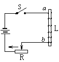 22、如图所示, 电感线圈的电感L=1mH, O点在滑动变阻器的中点, 电流表表盘的零刻度线在正中间. 当滑动触点P在a处时, 电流表指针左偏, 读数为2A; 当触点P在b处时, 电流表指针右偏, 读数也为2A. 触点P由a滑到b时, 经过的时间为0.02s, 求当P由a滑到b时, 在线圈L两端出现的自感电动势多大? 方向如何?