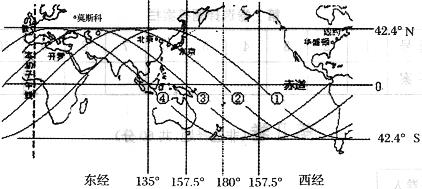 如图所示,是飞船控制中心的大屏幕上出现的一幅卫星运行轨迹图,它记录了“神舟”七号飞船在地球表面垂直投影的位置变化;图中表示在一段时间内飞船绕地球圆周飞行四圈,依次飞经中国和太平洋地区的四次轨迹①、②、③、④,图中分别标出了各地点的经纬度(如:在轨迹①通过赤道时的经度为西经157.5