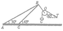 18.(8分)如下图所示,轻杆AB和BC组成一个固定的三角形支架,重力不计的滑轮用轻绳OB系在B点,跨过滑轮的轻绳一端系一重物G=100N,另一端在拉力T作用下使物体匀速上升,求(1)轻绳BO上的张力?(2)两根轻杆所受的力(忽略滑轮的摩擦)。