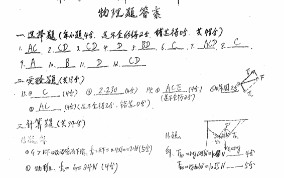 16.(9分)如下图所示,AO、BO、CO为三根轻绳,OB与水平天花板夹角为120°,AO与竖直墙壁夹角也为120°,物体质量m=2kg。求AO、BO绳所受拉力大小。(g=10N/kg)