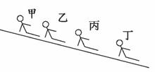 如图所示,在一个倾斜的长冰道上方,一群孩子排成队,每隔1 s有一个小孩往下滑.一游客对着冰道上的孩子拍下一张照片,照片上有甲、乙、丙、丁四个孩子.他根据照片与实物的比例推算出乙与甲和丙两孩子间的距离分别为12.5 m和17.5 m.请你据此求解下列问题