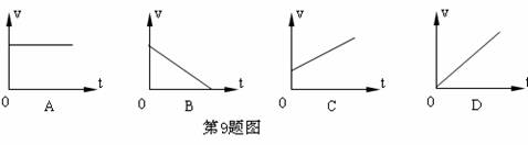 9.一物体从t=0时刻开始做自由落体运动,它下落的速度v与时间t的关系图象是下图中的哪个:( )