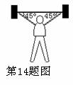 14.在第27届悉尼奥运会上,我国运动员占旭刚以惊人的勇气在最后一举中成功地举起了367.5kg的杠铃,终于夺得77公斤级举重冠军 ,为祖国赢得了荣誉。设占旭刚在最后一举中手臂与杠铃的夹角如图5所示。杠铃静止时,占旭刚每个手臂承受的压力为 (取g=10m/s2)