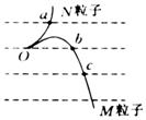 如图(6),虚线为电场中与场强方向垂直的等间距的平行直线,两粒子M、N质量相等,所带电荷量的绝对值也相等,现将M、N从虚线上的O点以相同速率射出,两粒子在电场中运动的轨迹分别如图中的两条实线所示,点a、b、c为实线与虚线的交点,已知O点电势高于C点电势,若重力不计,则( )