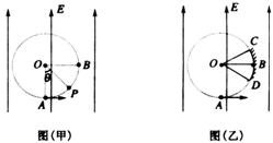 17.(17分)如图(9)中的图(甲)所示,在场强大小为E,方向竖直向上的匀强电场中存在着一个半径为R的圆形区域,O点为该圆形区域的圆心,A点是圆形区域的最低点,B点是圆形区域最右侧的点。在A点有放射源释放出初速度大小不同、方向均垂直于场强方向向右的正电荷,电荷的质量为m,电量为q。不计电荷重力及电荷之间的作用力。