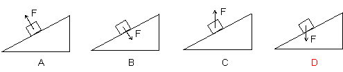 4.物块静止在固定的斜面上,分别按图示的方向对物块施加大小相等的力F,A中F垂直于斜面向上。B中F垂直于斜面向下,C中F竖直向上,D中F竖直向下,施力后物块仍然静止,则物块所受的静摩擦力一定增大的是 :