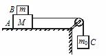 A、B、C三物块质量分别为M、m和m0,作如图所示的联结。已知绳子和滑轮的质量、滑轮的摩擦均可忽略不计,A、B间的接触面为水平,牵引A物块的绳子也沿水平方向。若B随A一起沿绳子拉力方向在水平支持面上作匀速运动,则( )