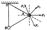 如图所示,用两根细线把A、B两小球悬挂在天花板上的同一点0,并用第三根细线连接A、B两小球,然后用某个力F作用在小球A上,使三根细线均处于直线状态,且0B细线恰好沿竖直方向,两小球均处于静止状态.则该力可能为图中的 ( )