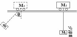 14.如图所示,在光滑水平轨道上有一小车质量为M2,它下面用长为L的绳系一质量为M1的砂袋,今有一水平射来的质量为m的子弹,它射入砂袋后并不穿出,而与砂袋一起摆过一角度θ。不计悬线质量,试求子弹射入砂袋时的速度V0多大?