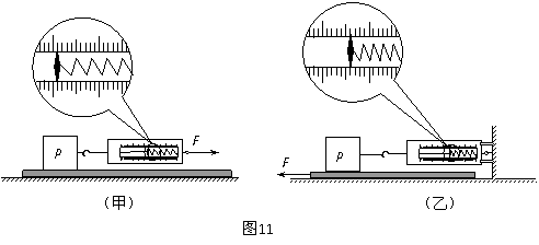 18.如图11中的甲、乙两图表示用同一套器材测量铁块P与长木板间的滑动摩擦力的两种不同方法.甲图使木板静止在水平桌面上,用手通过弹簧秤向右用力F拉P,使P向右运动;乙图把弹簧秤的一端固定在墙上,用力F水平向左拉木板,使金属板向左运动.(1)你认为这两种测量滑动摩擦力的方法中较好的是 .(2)图中已把(甲)、(乙)两种方法中弹簧秤的示数情况放大画出,则铁块P与木板间的滑动摩擦力的大小是 .