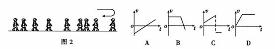 9.如图2所示,一同学沿一直线行走,现用频闪照相记录了他行走中9个位置的图片,观察图片,能比较正确反映该同学运动的速度一时间图象的是