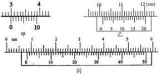 图中三个卡尺的读数为:甲图中的游标是10分度,则读数为___________mm;乙图中的游标是20分度,则读数为__________mm;丙图中的游标是50分度,则读数为__________mm。(游标卡尺的主尺最小分度都是1mm,)