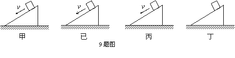 10. 如图所示,甲、乙、丙、丁四个质量、形状相同的斜面体放在水平面上固定不动,另有四个质量相同的小物块放在斜面顶端,已知小物块与斜面的接触面均粗糙。甲中物块匀加速下滑,乙中物块匀速下滑,丙中物块匀减速下滑,丁中物块静止在斜面上。则关于小物块受到的摩擦力及摩擦力的的方向下列说法正确的是: