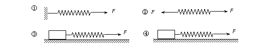 9、如图所示,四个完全相同的弹簧都处于水平位置,它们的右端受到大小皆为 F的拉力作用,而左端的情况各不相同:①中弹簧的左端固定在墙上,②中弹簧的左端受大小也为F的拉力作用,③中弹簧的左端拴一小物块,物块在光滑的桌面上滑动,④中弹簧的左端拴一小物块,物块在有摩擦的桌面上滑动。若认为弹簧的质量都为零,以l1、l2、l3、l4依次表示四个弹簧的伸长量,则有