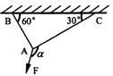 AB、AC两绳相交于A点,绳与绳、绳与天花板间夹角大小如图,现用一力F作用于交点A,与右绳夹角为
