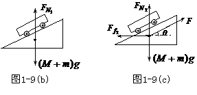 (2)因 m相对于M做匀速运动,仍以M、m组成的整体为研究对象,受力情况如图1-9(c)所示,因整体静止,可得: