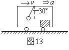 4.(选做题)如图13所示, 小车的顶棚上用绳线吊一小球, 质量为m, 车厢底板上放一个质量为M的木块,当小车沿水平面匀加速向右运动时,小球悬线偏离竖直方向30°, 木块和车厢保持相对静止,求: