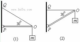 6.有两个相同的轻木杆OP,一端用铰链固定在墙壁上,另一端用细线QO栓住固定在墙壁上,当把质量均为m的物体挂在O点,图(1)中水平轻杆OP受到的压力为N1,斜拉细线QO受到的拉力T1 。图(2)中倾斜轻杆OP受到的压力为N2,水平细线QO受到的拉力T2 。则两个图中情况进行比较,下面结论正确的是:( )