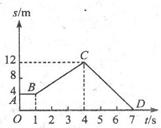 如图8所示的s-t图象,AB段表示质点处于______状态;BC段表示质点做______运动.前7s内质点的位移大小是_____