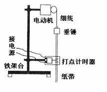 实验器材:玩具电动机,带有两个固定铁夹的铁架台,电磁打点计时器,低压交流电源,垂锤,细线,米尺,纸带,复写纸片,天平等。