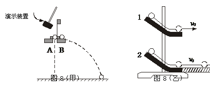 如下图8(甲)所示的演示实验中,不论演示装置距地面的高度如何,A、B两球总是同时落地,说明