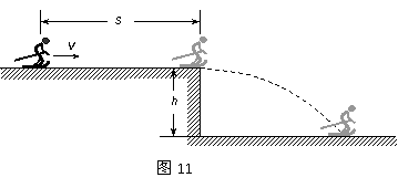 17.在冬天,高为h=1.25m的平台上,覆盖了一层冰,一乘雪橇的滑雪爱好者,从距平台边缘s=24m处以一定的初速度向平台边缘滑去,如图11所示,当他滑离平台即将着地时的瞬间,其速度方向与水平地面的夹角为θ=45°,取重力加速度g=10m/s2。求: