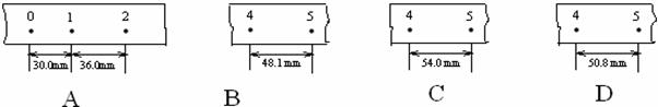 15.某同学在测定匀变速直线运动的加速度时,得到了几条较为理想的纸带,他已在每条纸带上按每5个点取好一个计数点,即两计数点之间的时间间隔为0.1s,依次打点先后为0,1,2,3,4,5。由于不小心,几条纸带都被撕断了,如下图所示,请根据给出的A、B、C、D四段纸带回答: