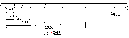 7.某次实验用打点计时器交流电的频率为50Hz,纸带的记录如图所示,图中前几个点模糊,因此从A点开始每打五个点取一个计数点,其中B、C、D、E点的对应速度vB=_____m/s, vC=_____m/s, vD=_____m/s, vE=_____m/s,由此推得F点的速度vF=_____m/s.