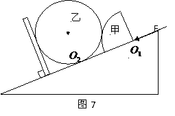 圆的柱状物体甲放在斜面上,半径与甲相等的光滑圆球乙被夹在甲与挡板之间,没有与斜面接触而处于静止状态,如图7所示。现在从球心