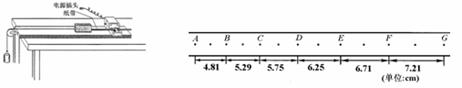 13.实验装置如左下图所示。一木块放在水平长木板上,左侧拴有一细软线,跨过固定在木板边缘的滑轮与一重物相连,木块右侧与打点计时器的纸带相连,在重物牵引下,木块在木板上向左运动。右下图给出了打点计时器在纸带上打出的一些点。打点计时器所用交流电频率为50Hz,不计纸带与木块间的拉力。