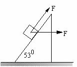 (12分)在光滑的倾角θ=530斜面上有一个质量为m=10Kg的物体,当沿斜面向上和沿水平方向向右各加一个大小都为F的力作用于这个物体时,物体正好处于静止状态,如图所示.求力F大小和物体对斜面的压力大小.(sin530=0.8,cos530=0.6)