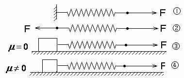 ①中弹簧的左端固定在墙上;②中弹簧的左端受到大小也为F的拉力;③中弹簧的左端拴一小物块,物块在光滑水平面上滑动;④中弹簧的左端拴一小物块,物块在有摩擦的桌面上滑动,用