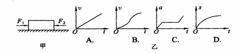 如图甲所示,放在光滑水平面上的木块受到两个水平力F1与F2的作用,静止不动,现保持力F1不变,使力F2逐渐减小到零,再逐渐恢复到原来的大小,在这个过程中,能正确描述木块运动情况的图象是图乙中的( )