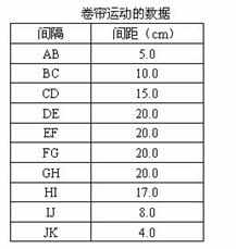 利用打点计时器研究一个约1.4 m高的商店卷帘窗的运动.将纸带粘在卷帘底部,纸带通过打点计时器随帘在竖直面内向上运动.打印后的纸带如图所示,数据如表格所示.纸带中AB、BC、CD……每两点之间的时间间隔为0.10 s,根据各间距的长度,可计算出卷帘窗在各间距内的平均速度v平均,可以将v平均近似地作为该间距中间时刻的即时速度v。