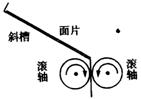 加工面条时,要先把和好的面团轧成面片,然后再用刀切割成面条,如图所示,在轧面片的过程中,斜槽中的面片经过下面两个沿图示方向转动的滚轴时被轨薄,请根据所学知识判断下列说法正确的是