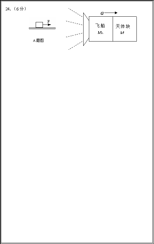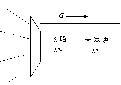 一艘宇宙飞船的总质量为M0,装有发动机推力显示仪、速度显示仪以及计时器。在外太空航行时遇到一个“漂浮”的小天体块,其体积大小和飞船差不多。宇航员决定采用动力学的方法估测它的质量。首先让飞船的船头慢慢和天体块“对接”,然后开动飞船发动机推动天体块一起匀加速直线运动(原理示意如图),从推力显示仪上读出此时飞船的推力恒为F ,接下来,宇航员还需记录哪些数据才可以测出该天体块的质量?请用字母符号表示这些数据,求出小天体块的质量M的表达式。