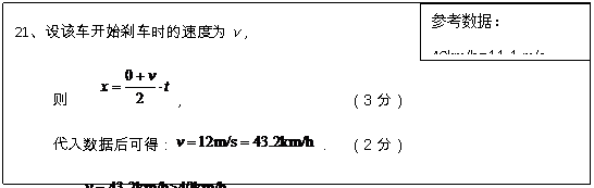 21.(7分)某市规定:卡车在市区内行驶速度不得超过40km/h.一次一辆卡车在市区路面紧急刹车后,经1.5s停止,量得刹车痕迹x =9m,问该车开始刹车时的速度为多大?该车是否违章?