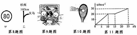 8.为了使公路交通有序、安全,路旁立了许多交通标志.如图所示,甲图是限速标志(白底、红圈、黑字),表示允许行驶的最大速度是80 km/h;乙图是路线指示标志,表示到杭州还有100 km.上述两个数据的物理意义是( )