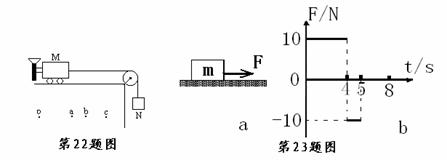 22.一小车M上装有一个滴墨水的容器,容器下端离地很近,每隔相等的时间滴出一滴墨水.重物N通过滑轮用绳拉动小车做初速度为零的匀加速直线运动,小车经过处, 在桌面上留下一系列墨滴, 如图所示,o点是车上滴下的第一滴墨水点,oa间还有若干滴墨水点没有画上。测出ab=0.36m bc=0.44 m.则ob= ▲ m