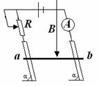 12.(12分)如图所示,两平行光滑铜杆与水平面的倾角α均为300,其上端与电源和滑动变阻器相连,处于竖直向下的匀强磁场中,调节滑动变阻器R,当电流表的读数I=2.5A时,横放在铜杆上的铝棒恰能静止。铝棒的质量m=2kg,两杆间的距离L=40cm。求此磁场的磁感应强度。