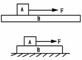 3.如图所示,放在水平地面上的木板B,A物体放在B木板之上受水平向右的拉力F。若A、B均静止,B给A是 摩擦,其方向向 ,A给B是 摩擦,其方向向 ,地给B是 摩擦,其方向向 ;若B静止A运动,B给A是 摩擦,A给B是 摩擦,地给B是 摩擦,其方向向 ;若B静止A运动,B给A是 摩擦,A给B是 摩擦,地给B是 摩擦;若A、B相对静止,且一起向右运动,A受B的是 摩擦,对A是 摩擦,对A是 力(填:动或阻)B受A的是 摩擦,对B是 力,B受地的是 摩擦,对B的效果是 力。