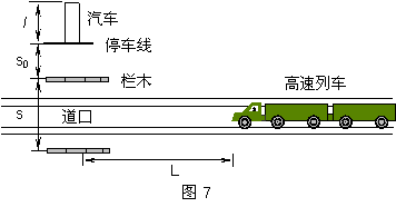 10.为确保安全,在铁路与公路交叉的道口处需装有自动信号灯。当列车还有一段距离才到达公路道口时,道口应亮出红灯,警告未越过停车线的汽车迅速制动,已越过停车线的汽车抓紧通过。如果汽车通过道口的速度v1=36km/h,停车线距道口栏木的距离s0=5 m,道口宽度s=26 m,汽车长l=15 m(如图7所示),把火车和汽车的运动都看成匀速直线运动。问:当列车离道口的距离L为230m时亮红灯,为确保已越过停车线的汽车安全驶过道口,列车的最大速度应为多大?