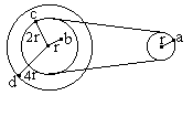 右图中所示为一皮带传动装置,右轮的半径为r,a是它边缘上的一点。左侧是一轮轴,大轮的半径为4r,小轮的半径为2r。b点在小轮上,到小轮中心的距离为r。c点和d点分别位于小轮和大轮的边缘上。若在传动过程中,皮带不打滑。则 ( )